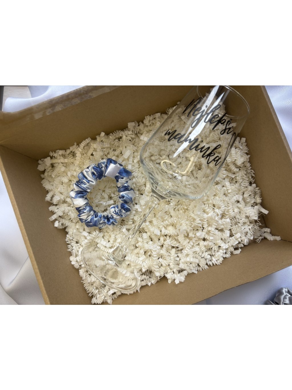Box pro maminku ve kterém se nachází sklenička a malá saténová gumička