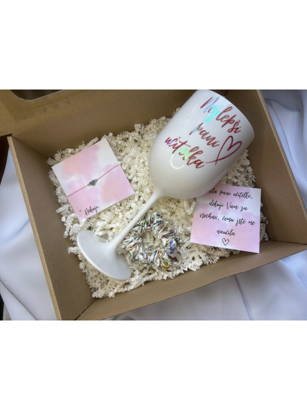 Box pro paní učitelku sklenička, malá saténová gumička a šperk