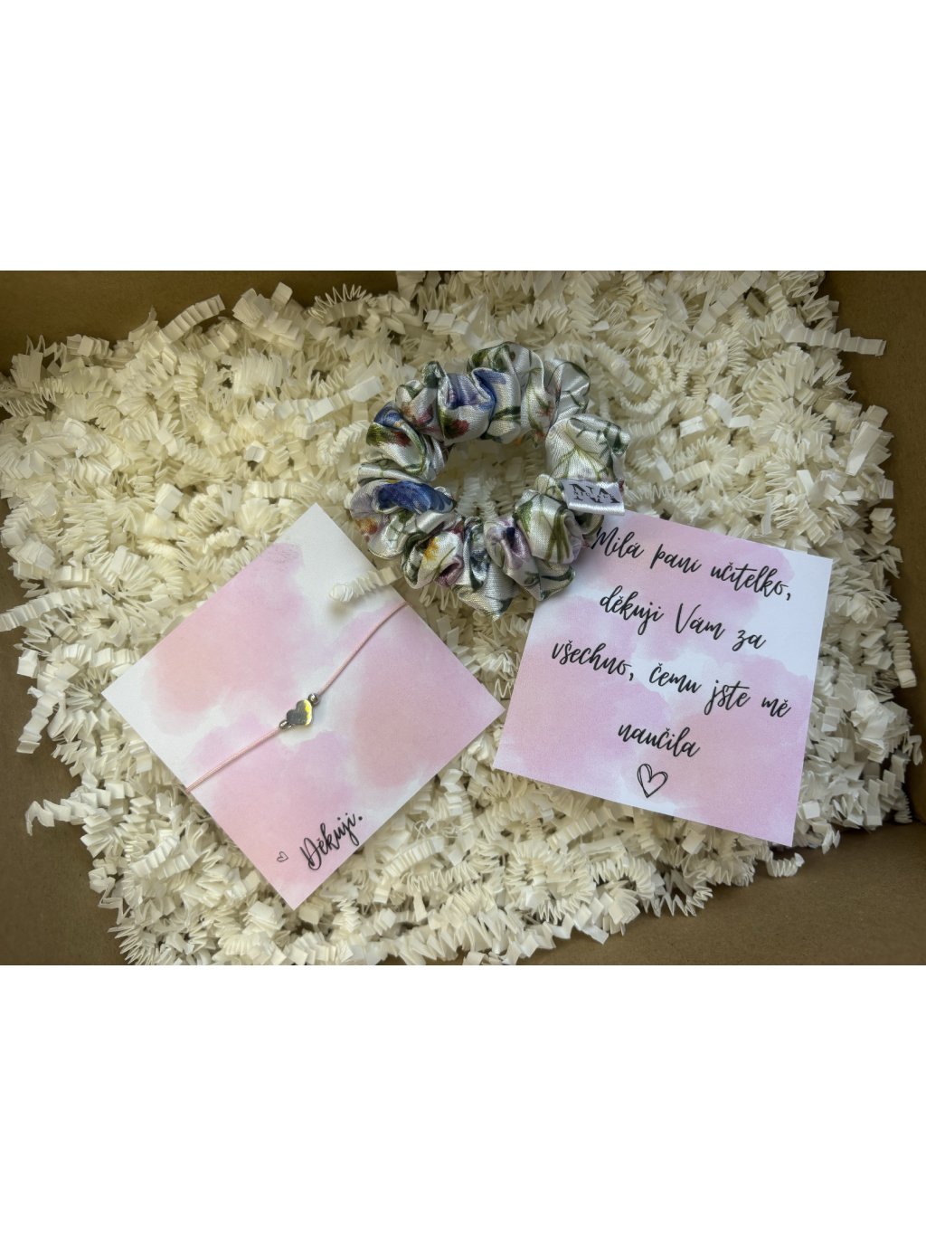 Dárkový BOX pro paní učitelku malá saténová gumička a šperk. V balení je i děkovná kartička, kterou můžeme vytvořit na přání.