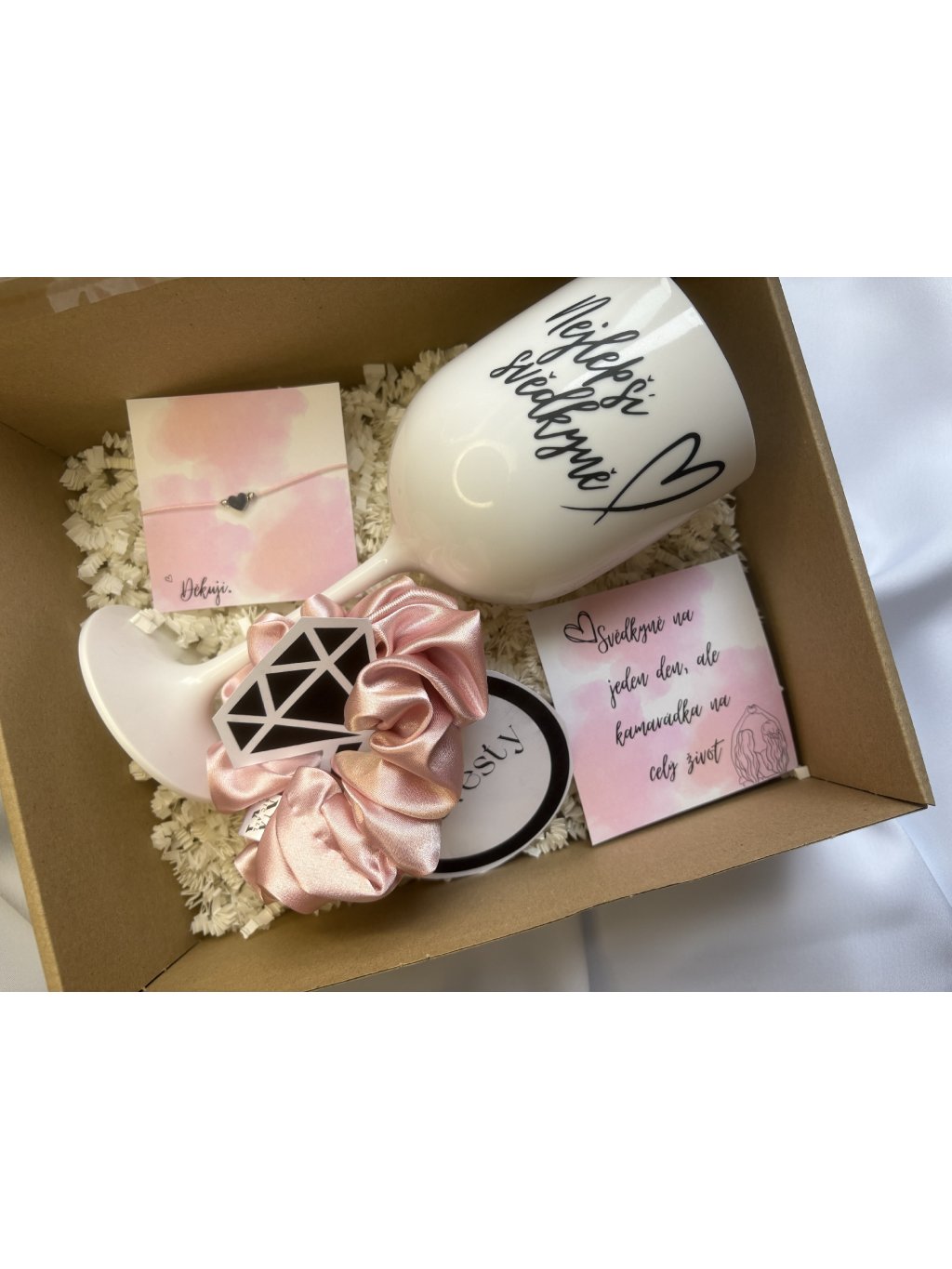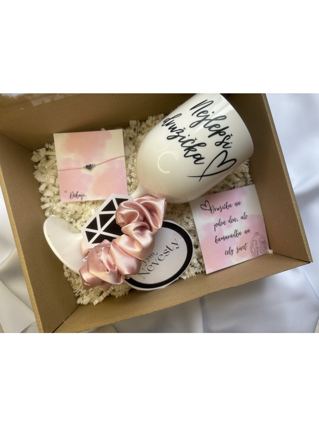 Dárkový BOX pro svědkyni/ družičku se skleničkou( skleněná průhledná/ bílá plastová) velká saténová gumička a šperk. V balení je i děkovná kartička, kterou můžeme vytvořit na přání.