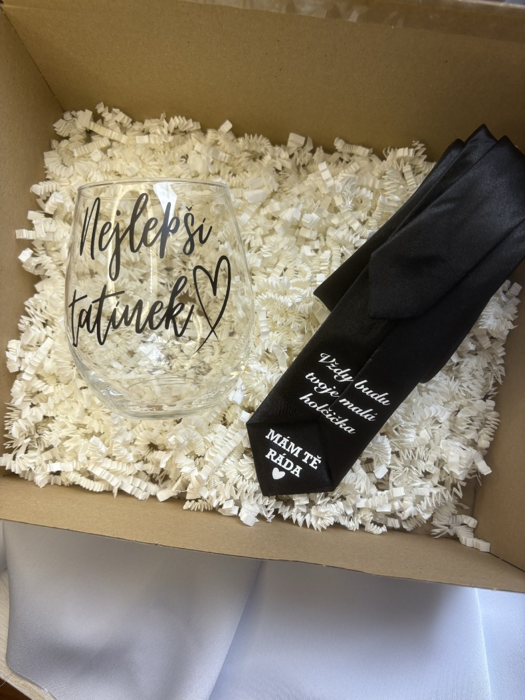 Obsah boxu: Kravata s vlastním textem - máte zájem o jinou barvu kravaty nebo změnit text? stačí nás kontaktovat a nebo napsat info do poznámky k objednávce.