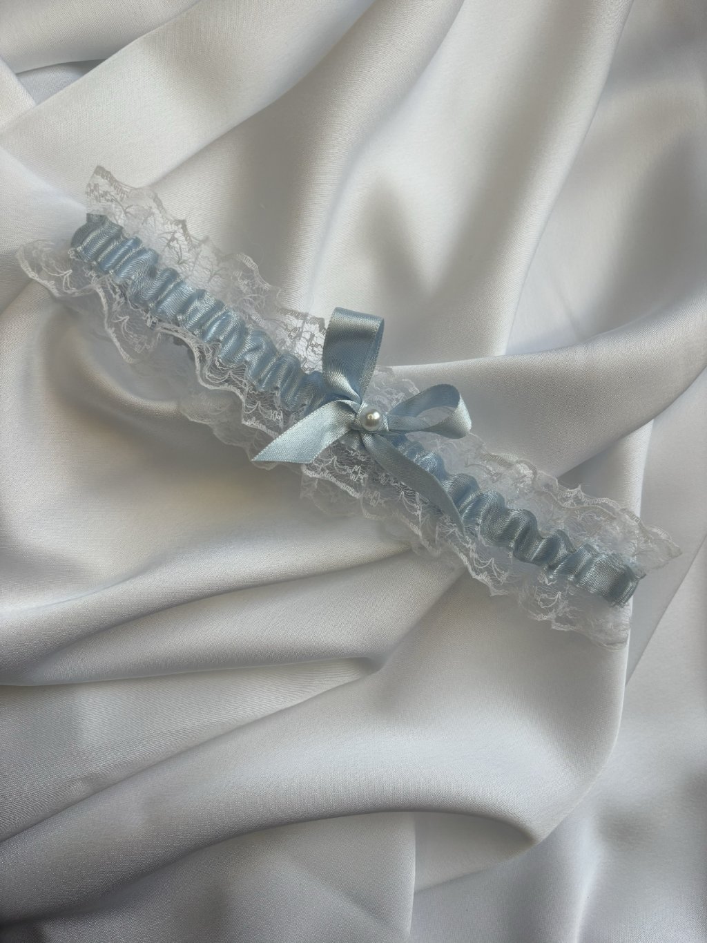Krajkový svatební podvazek s modrou mašličkou a perlou