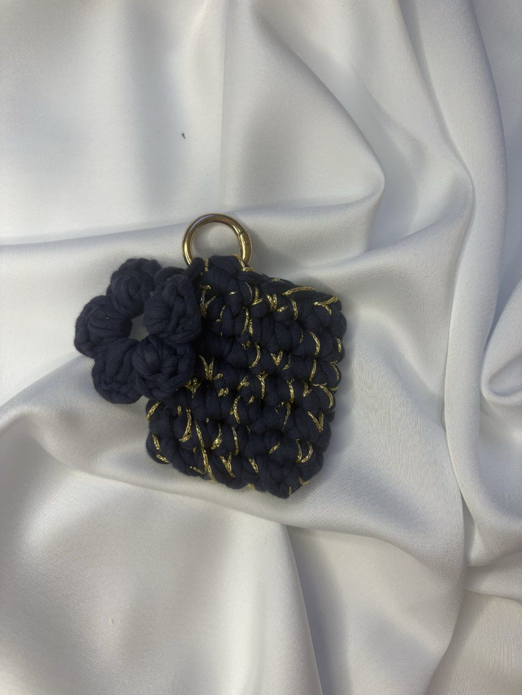 Měkký pelíšek pro vaše sluchátka v luxusním provedení. Ručně háčkovaný obal z temně modré příze protkané zlatou nití ochrání vaše sluchátka před poškrábáním i pády. Díky praktické karabině a roztomilé kytičce se stane ozdobou vaší kabelky, klíčů nebo popruhu na telefon.