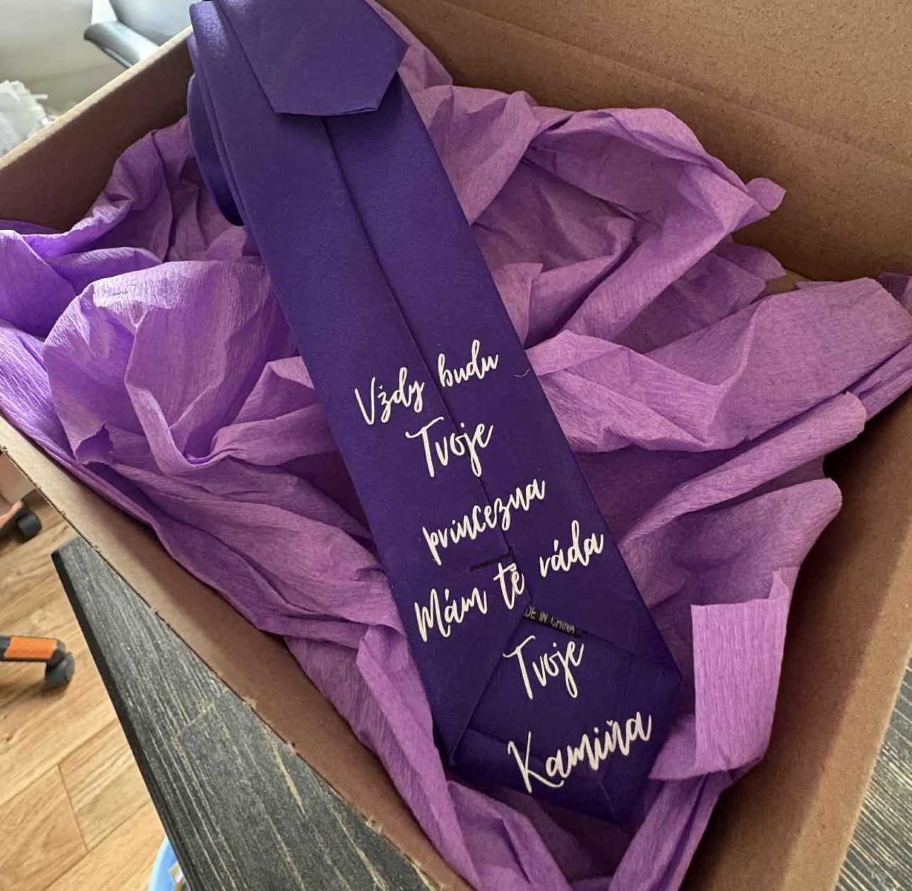 U paní Nicole jsem vybírala kravatu a motýlka na svatbu ve fialové barvě s tím, že jsem chtěla i věnování. Komunikace s paní je rychlá a prímová, Nicole je moc milá, ochotná a ráda poradí