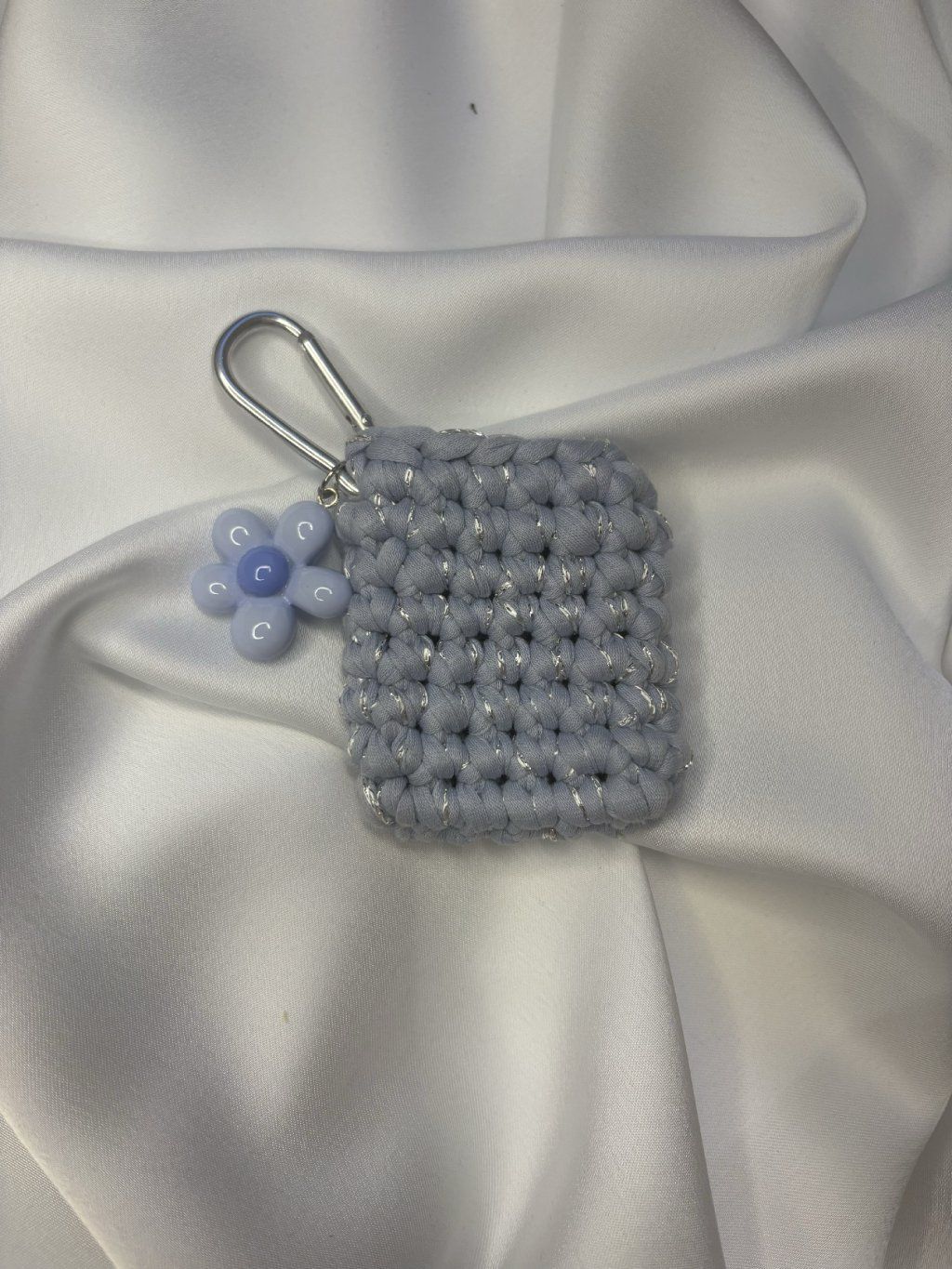 Zabalte svá sluchátka do třpytivého obláčku. Ručně háčkované pouzdro ve světle šedé barvě se stříbrnou nitkou kombinuje styl s praktickou ochranou. Doplněné o roztomilý modrý přívěsek ve tvaru kytičky a pevnou karabinu, díky které už svá sluchátka nikdy nebudete muset hledat na dně tašky.